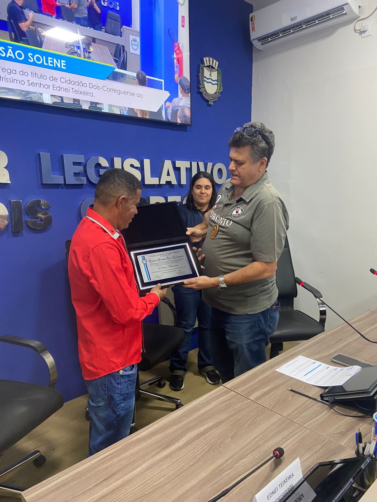 O Título de Cidadão Dois-Correguense foi proposto pelo Vereador Trevisan, com o propósito de homenagear o senhor Ednei Teixeira, por sua trajetória no município de Dois Córregos.