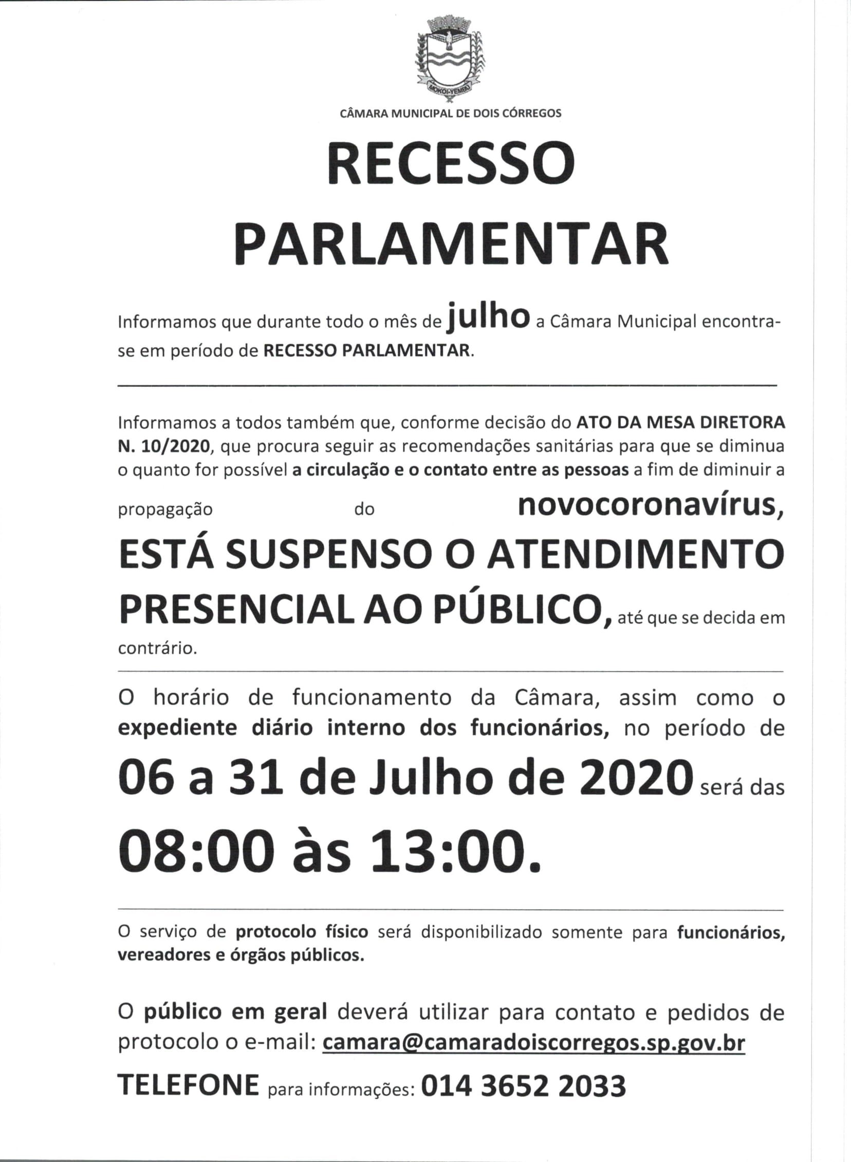 Aviso sobre o horário de funcionamento da Câmara Municipal de Dois Córregos no período de 06 a 31 de julho de 2020