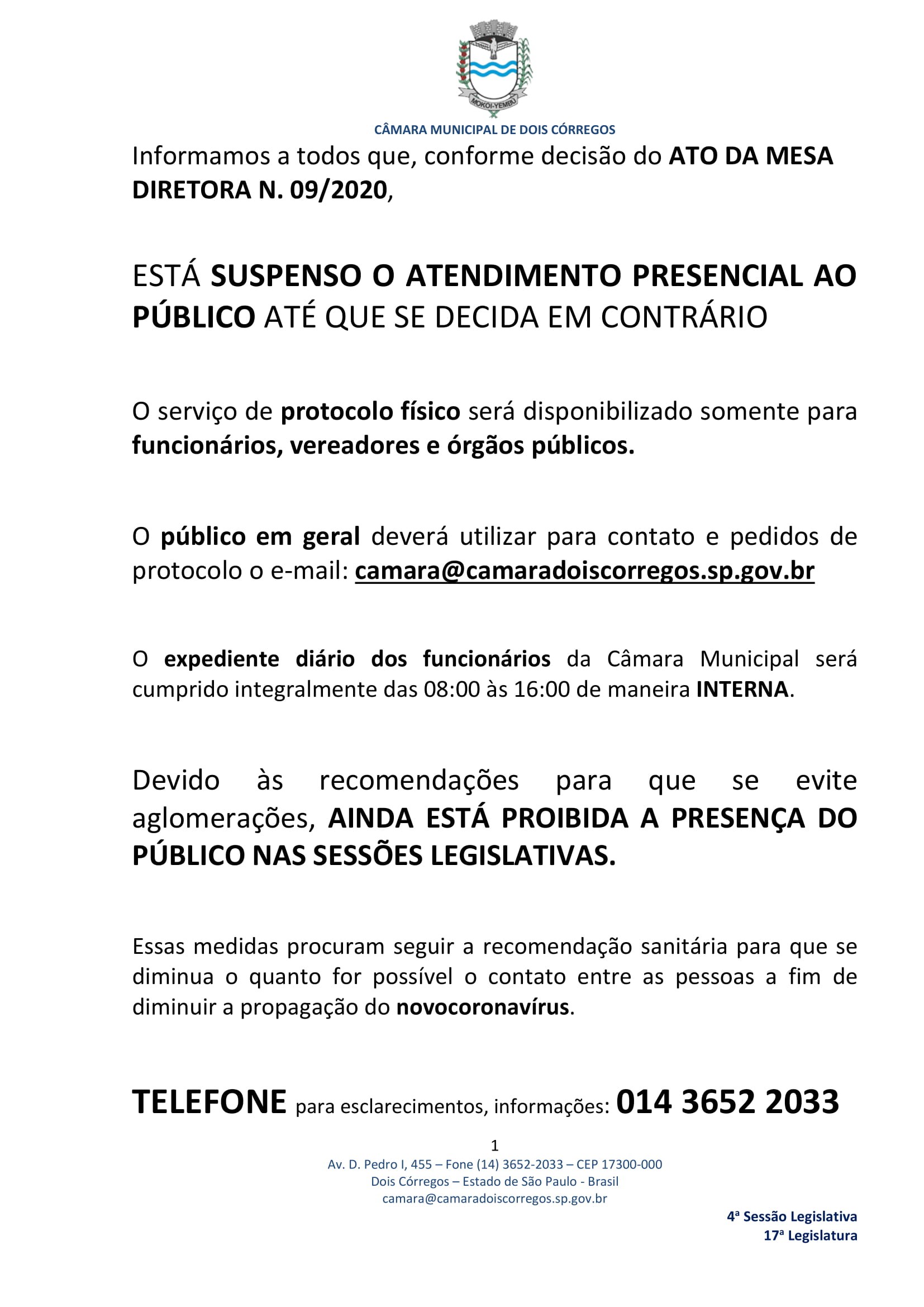 Informe sobre o atendimento na Câmara Municipal de Dois Córregos - 19/06/2020